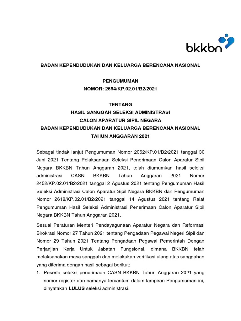 Pengumuman Hasil Sanggah Seleksi Administrasi Casn Bkkbn Ta 2021 Pdf